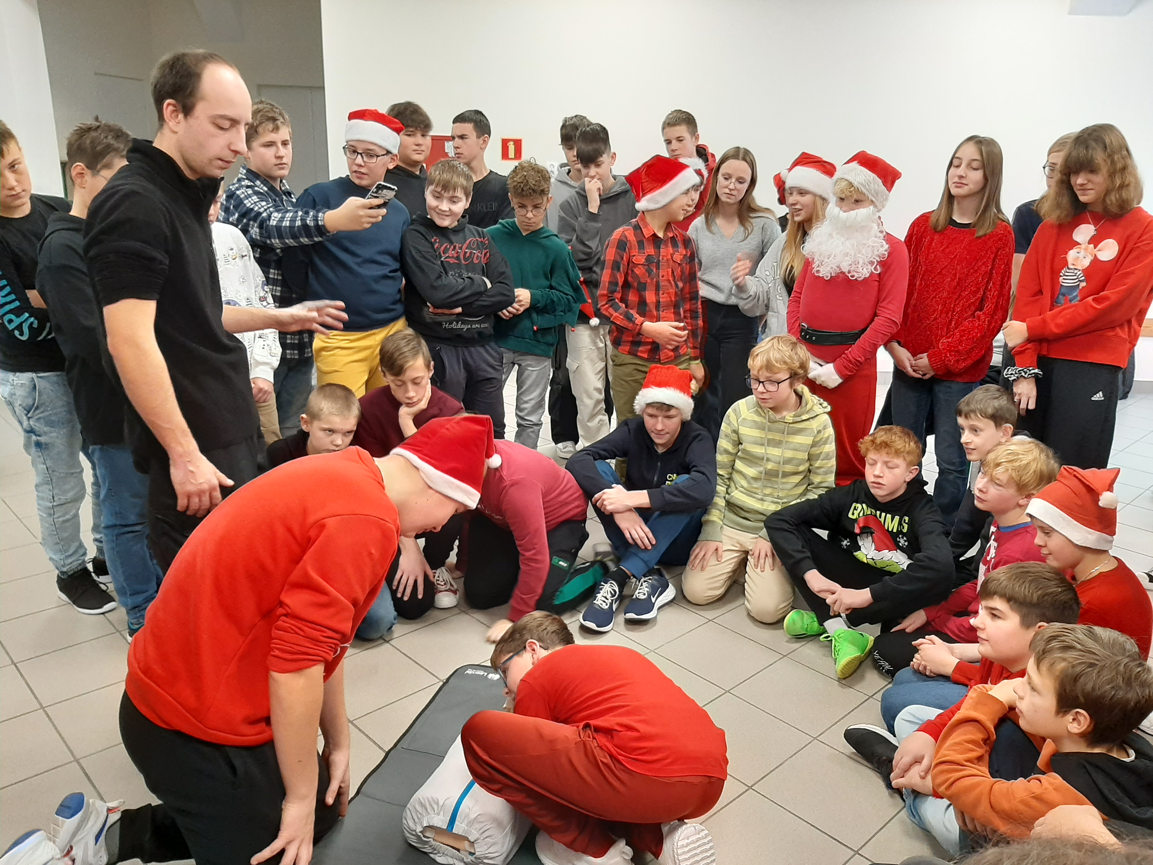 6 grudnia odwiedził nas nie tylko Mikołaj, ale także druhowie z OSP w Tymbarku. Pani Małgosia i pan Karol uczyli nas udzielania pierwszej pomocy przedmedycznej. Oprócz teorii otrzymaliśmy cenne wskazówki instruktażowe. Druhowie pokazali nam, jak należy prawidłowo ułożyć osobę poszkodowaną, jak przeprowadzić resuscytację i jak używać defibrylatora AED. Po pokazie mogliśmy wziąć udział w ćwiczeniach praktycznych na fantomie. Dla wszystkich uczniów klas 6-8 była to niezwykle cenna lekcja i zarazem wspaniały mikołajkowy prezent.