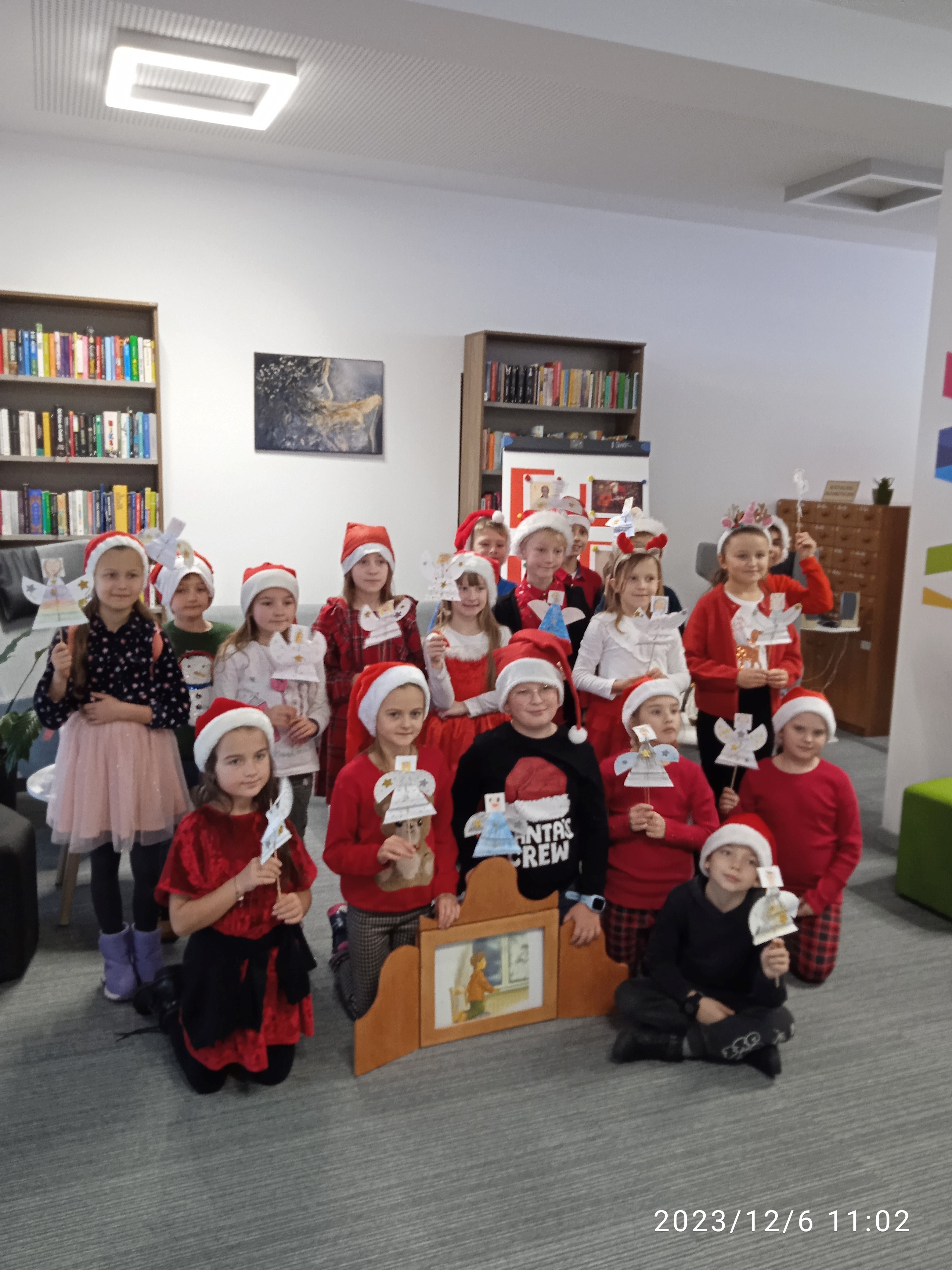 6 grudnia nasza wychowawczyni wraz z  panią bibliotekarką zorganizowały nam wyjazd do Domu Kultury w Limanowej. Na miejscu czekały na nas panie pracujące w bibliotece dla dzieci i dorosłych. Pokazały nam wiele ciekawych miejsc, między innymi nowoczesną czytelnię multimedialną, galerię obrazów i rzeźb, a także książkomat.  Obejrzeliśmy też teatrzyk kamishibai pt. „Trzy gwiazdki szczęścia”, który bardzo nam się podobał.  Panie przygotowały  dla nas  zajęcia plastyczne, na których każdy mógł zrobić aniołka i zabrać go ze sobą. Na koniec zaśpiewaliśmy pastorałkę, a Tosia wręczyła paniom bibliotekarkom świecące aniołki wykonane przez jej mamę. Chyba sprawiliśmy paniom ogromną radość, bo prezenty bardzo im się podobały. W mikołajki swoje święto obchodzą też aniołki. Czas szybko płynął i musieliśmy wracać. W szkole czekał  już św. Mikołaj. Wszystkich obdarował wspaniałymi prezentami. Było super!