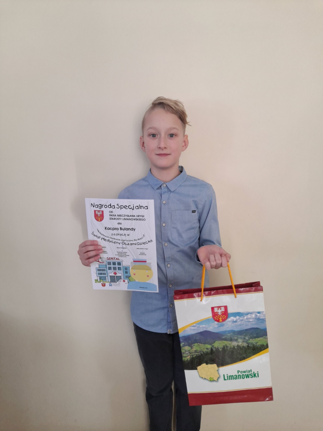 21 grudnia 2021 r. został rozstrzygnięty konkurs plastyczny pt. „Świat medyczny w oczach dziecka” organizowany przez Panią Karinę Gamoń, nad którym honorowy patronat objęli Mieczysław Uryga Starosta Limanowski oraz Marcin Radzięta, Dyrektor Szpitala Powiatowego w Limanowej. W konkursie brały udział dzieci w wieku przedszkolnym i szkolnym. Na konkurs wpłynęło ponad 50 prac plastycznych z powiatu limanowskiego. Zgodnie z regulaminem przyznano dwie nagrody specjalne, a jedną z nich otrzymał Kacper Bulanda, uczeń klasy 3b ze Szkoły Podstawowej w Tymbarku. Oprócz dwóch nagród specjalnych organizator przyznał 12 wyróżnień, z których dwa trafiły również do uczniów klasy 3b z naszej szkoły: Tymona Haloty i Amelki Wilczyńskiej.