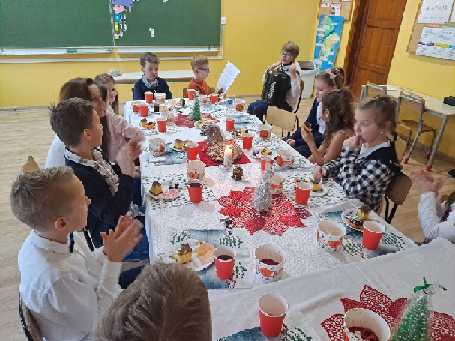 17 grudnia 2021 roku w naszej klasie odbyła się Wigilia. Wszyscy w tym dniu przyszliśmy ubrani odświętnie. Gdy weszliśmy na pierwszą lekcję, w sali czekali już rodzice, którzy wcześniej przygotowali nam Wigilię. Sala w tym dniu wyglądała inaczej niż zwykle. Na środku znajdował się jeden długi stół, który był nakryty białym obrusem. Na nim znajdowały się stroiki świąteczne, świeca i sianko, na którym były opłatki, barszcz z uszkami, kompot, babeczki, pierniki, sernik oraz cukierki. Sala była przystrojona naszymi pracami plastycznymi. Na oknach były zawieszone aniołki i bombki, a na szafkach choinki i mikołaje. Wychowawczyni rozdała nam opłatki. Rozpoczął się czas życzeń. Gdy skończyliśmy składać sobie życzenia, zaczęliśmy jeść przygotowane potrawy. Atmosfera była bardzo przyjemna. Śpiewaliśmy kolędy. Nasz kolega i koleżanki grali nam na instrumentach muzycznych, co jeszcze bardziej wprawiło nas w świąteczny nastrój.